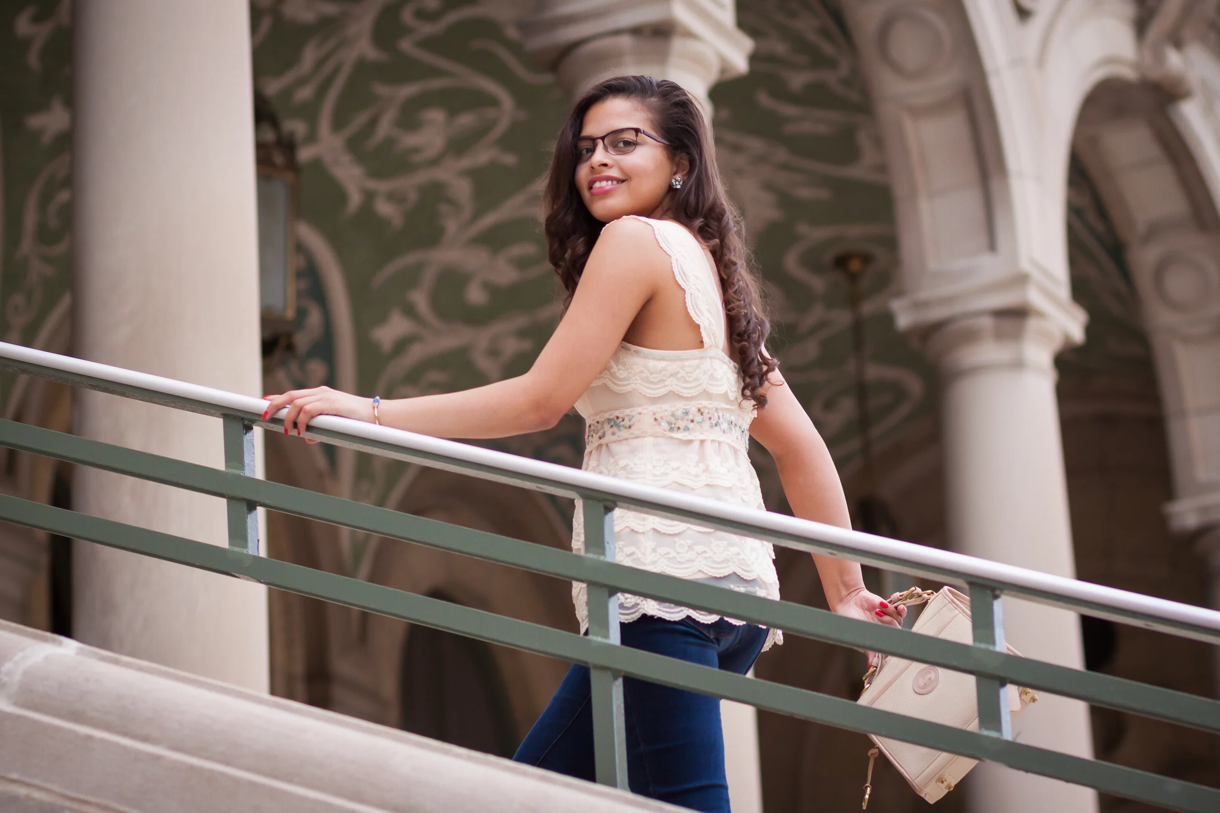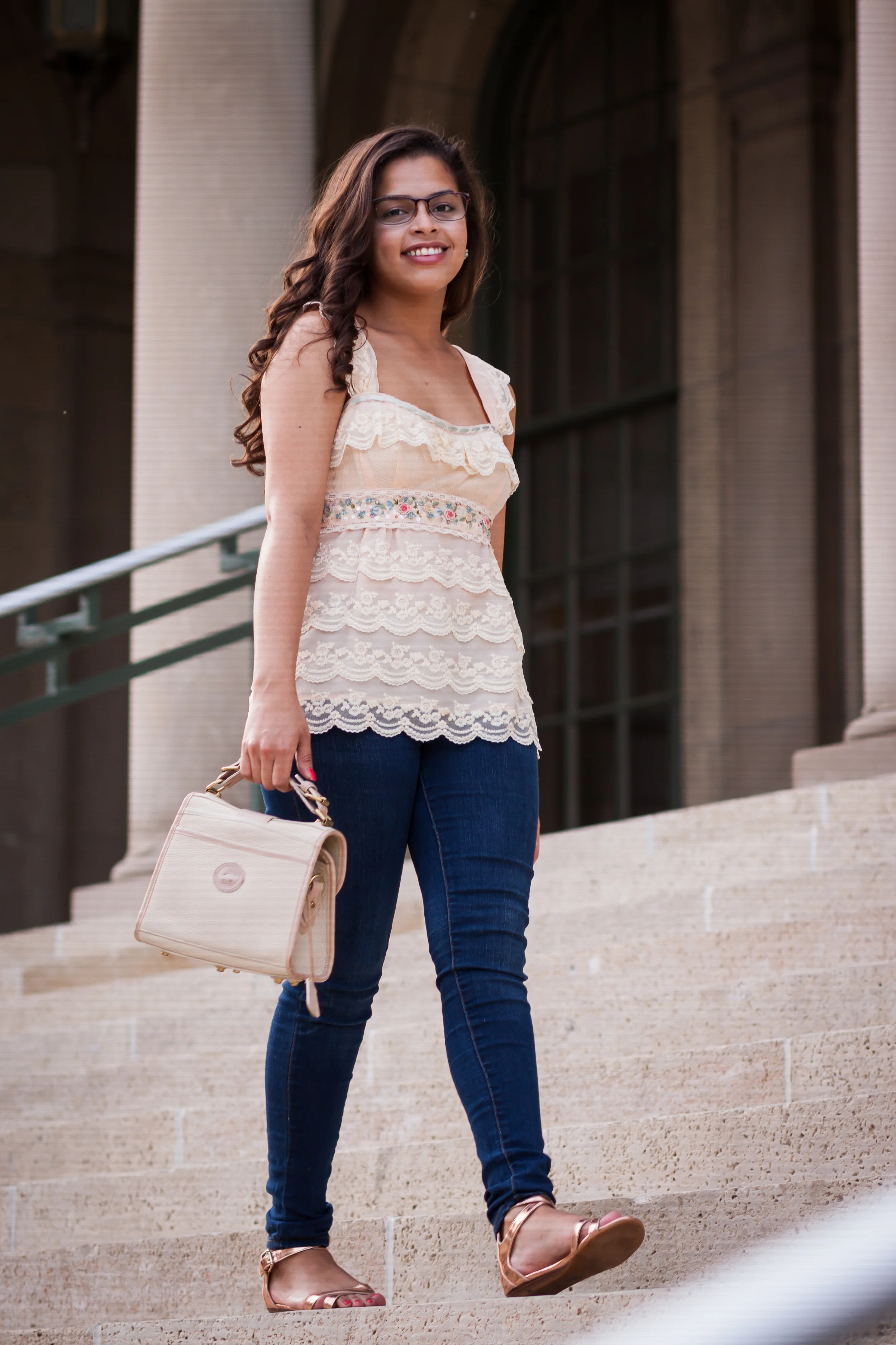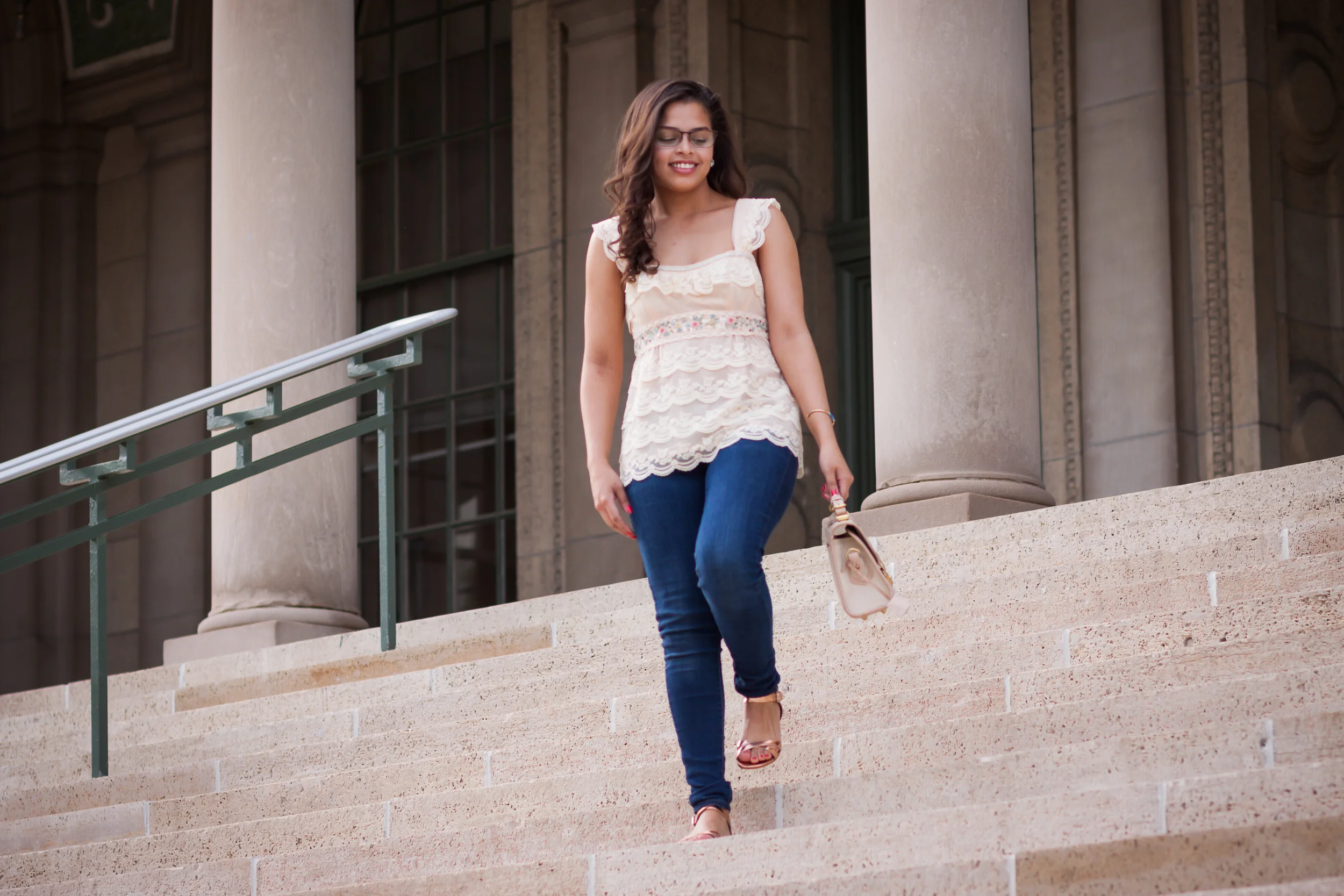 We all have those days where no matter what we try on, we cannot figure out what to wear and end up with a pile of clothes on the floor. For days like these lace is my go-to because it instantly gives me a "dressed up" feeling. Something about lace screams feminine such like the scalloped details of the sleeves. To keep this effortlessly casual, I paired it with Levi skinny jeans. When styling this top less is definitely more because of all its intricate detailing. Teal floral stud earrings accentuate the little flowers on the bodice and a delicate jeweled cuff complements the jeans and adds a little sparkle. The warm weather brings not only bold colors, but also metallics that lend texture and shine such as these Rebecca Minkoff sandals that top off this easy breezy and feminine look!
