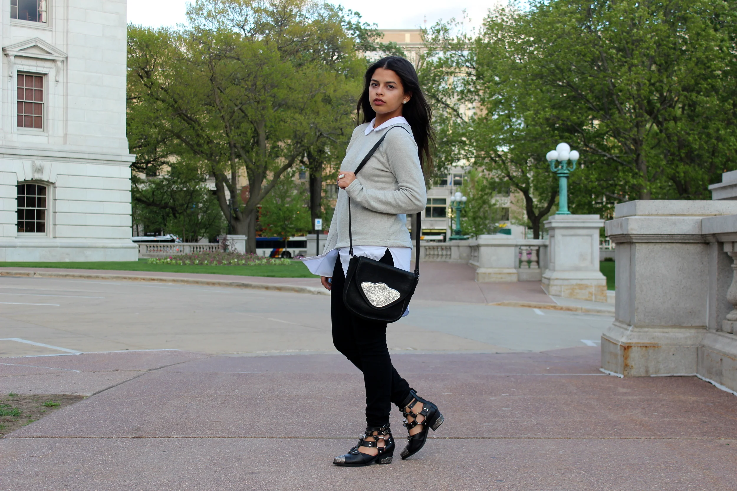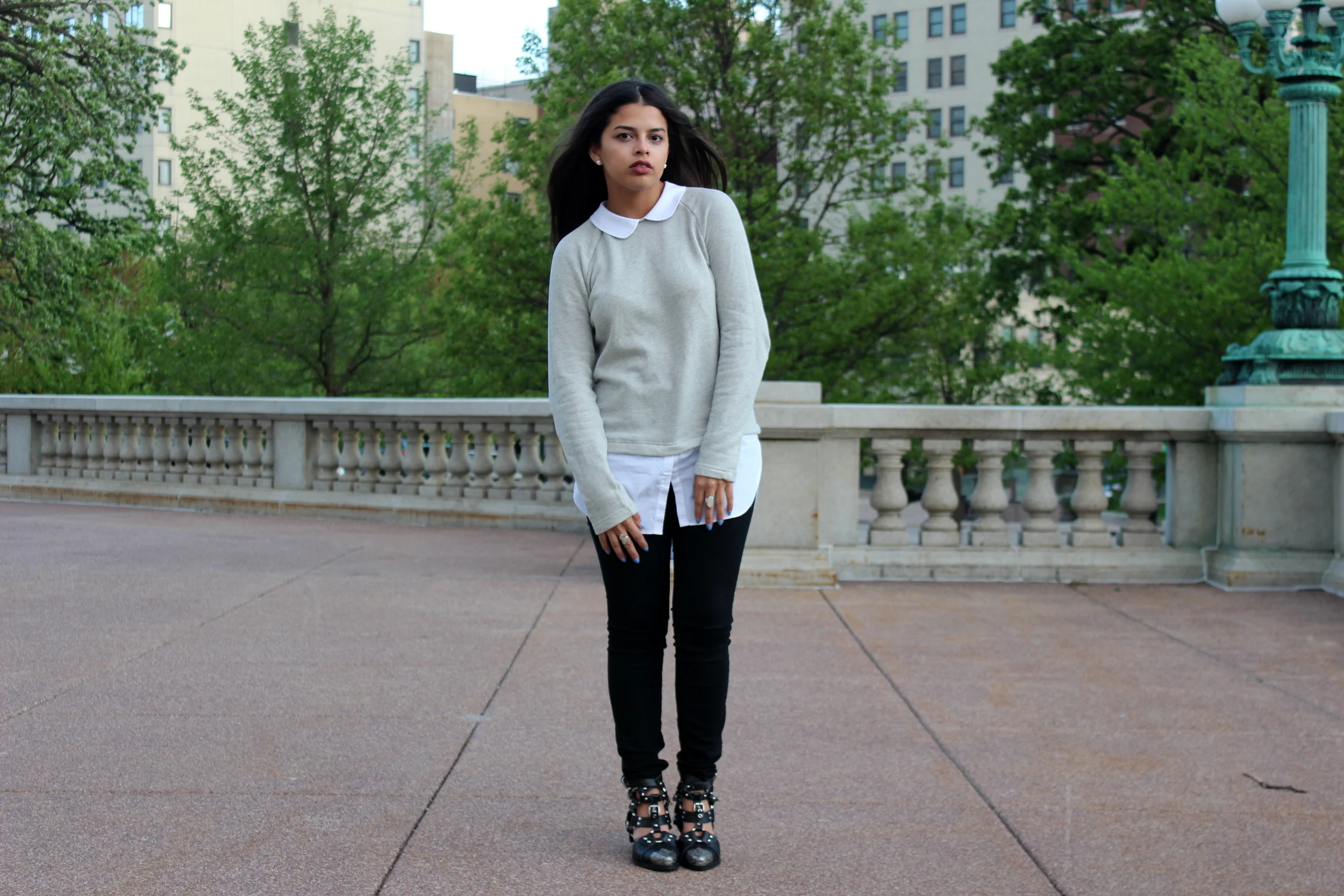 Hello everyone! These last couples of days have been a little bit chilly with it being cloudy and raining. I even saw people with their winter jackets one day, but there is no way I was going to bring that back out. I chose to stay warm with a lightweight sweater from Urban Outfitters. I love that this sweater is ready to wear with its attached Peter Pan collar and shirttail that look adorable. I paired it with the BDG high rise skinny jeans because they are nice and tight but stretchy at the same time. Loafers are a great option for any preppy look, but this time, I wanted something more edgy. The Jeffrey Campbell Temeku boots make that statement and when paired with this vintage leather bag, it also gives a subtle western vibe that I love. Pearls stud enhance the preppy vibe I'm going for while also keeping it simple. I love the UO nail polish! They come in amazing colors that dry fast, just like this Dreamy blue I chose as a small pop of color. I hope you enjoyed this look that says, "I'm sweet, but don't cross me". Have a great rest of the week!